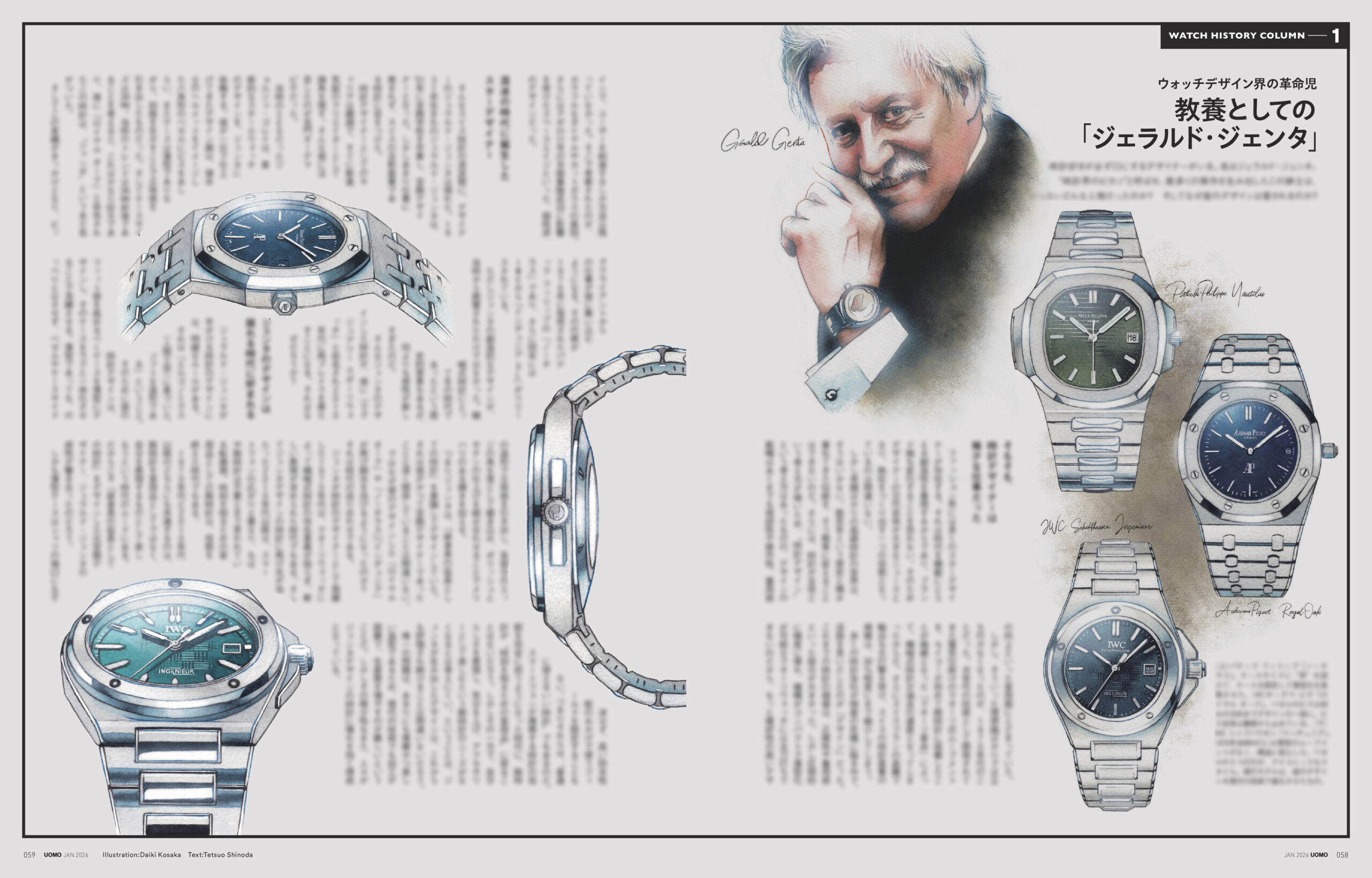 UOMO 2026年1月号で時計と人物のイラストカットを描かせていただきました。